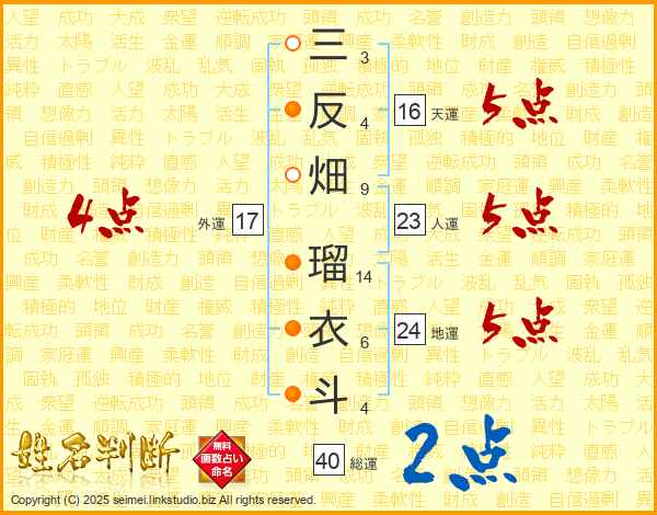 生活面を象徴する運勢です。外部から受ける影響力を表し、結婚運、家庭運や職場、環境への順応性を表します。総運から人運を引いた画数。姓や名が1文字の場合を除く。