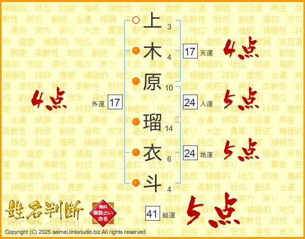 上(3画)木(4画)原(10画) 瑠(14画)衣(6画)斗(4画)