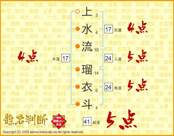 上(3画)水(4画)流(10画) 瑠(14画)衣(6画)斗(4画)