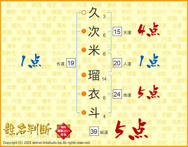 久(3画)次(6画)米(6画) 瑠(14画)衣(6画)斗(4画)