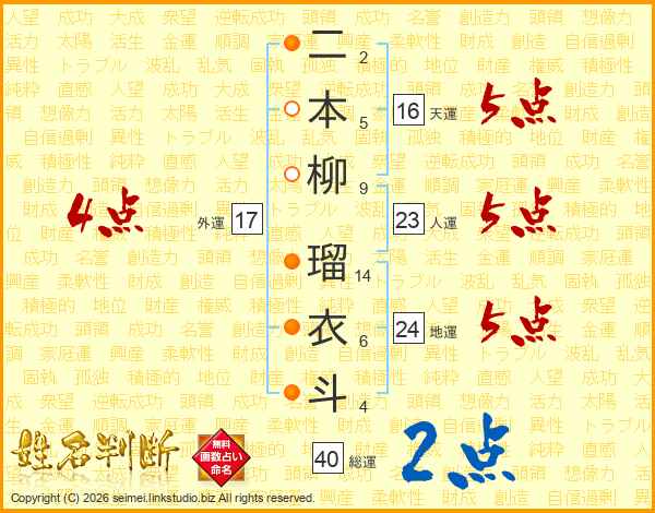 二(2画)本(5画)柳(9画) 瑠(14画)衣(6画)斗(4画)