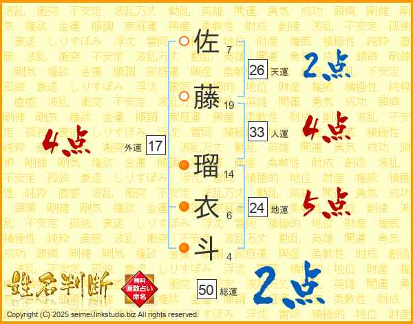 佐藤瑠衣斗さんの総運は50画の2点!