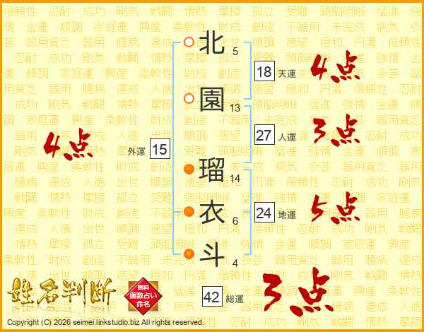 北(5画)園(13画) 瑠(14画)衣(6画)斗(4画)