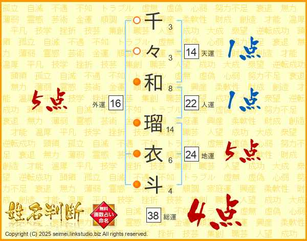 千(3画)々(3画)和(8画) 瑠(14画)衣(6画)斗(4画)