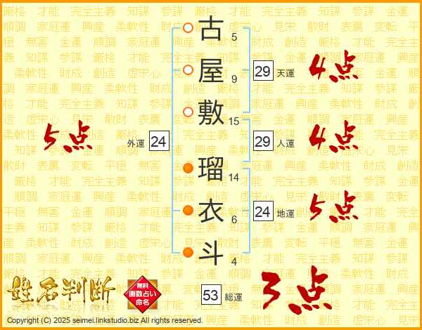 古屋敷瑠衣斗さんの外運は24画の5点!