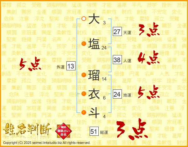 大(3画)塩(24画) 瑠(14画)衣(6画)斗(4画)