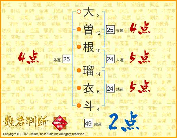 大曽根瑠衣斗さんの総運は49画の2点!