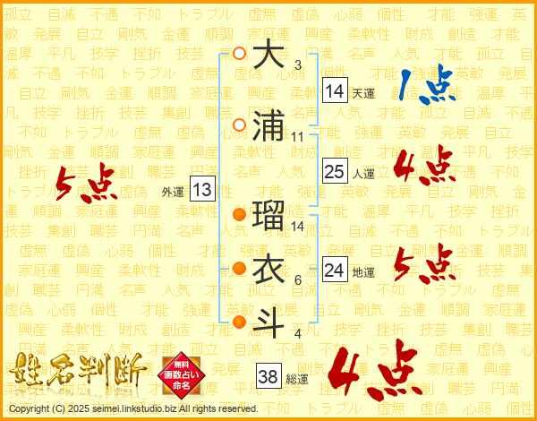 大(3画)浦(11画) 瑠(14画)衣(6画)斗(4画)