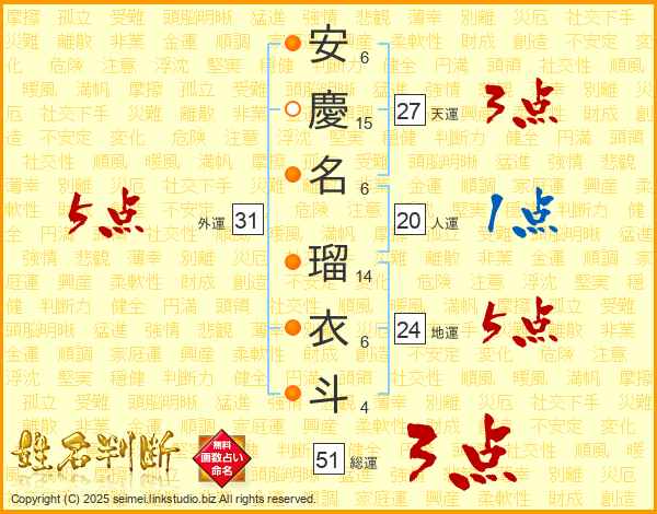 安(6画)慶(15画)名(6画) 瑠(14画)衣(6画)斗(4画)
