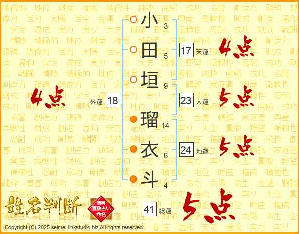 小(3画)田(5画)垣(9画) 瑠(14画)衣(6画)斗(4画)