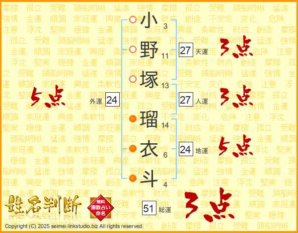 小野塚瑠衣斗さんの総運は51画の3点!