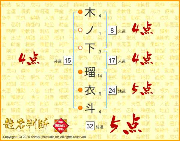 木ノ下瑠衣斗さんの外運は15画の4点!
