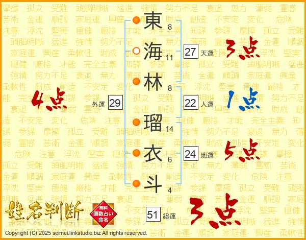 東(8画)海(11画)林(8画) 瑠(14画)衣(6画)斗(4画)