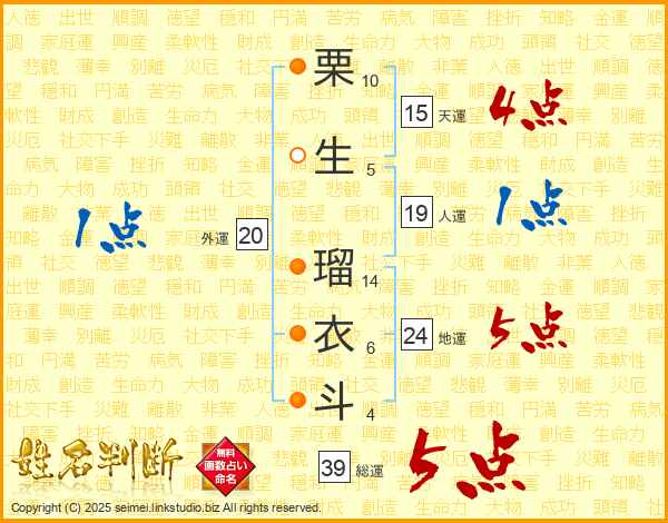 栗(10画)生(5画) 瑠(14画)衣(6画)斗(4画)
