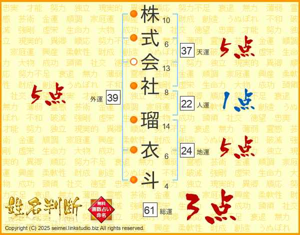株(10画)式(6画)会(13画)社(8画) 瑠(14画)衣(6画)斗(4画)