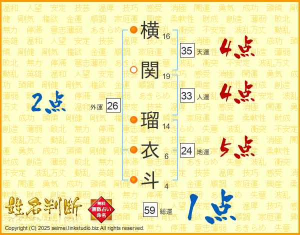 横(16画)関(19画) 瑠(14画)衣(6画)斗(4画)