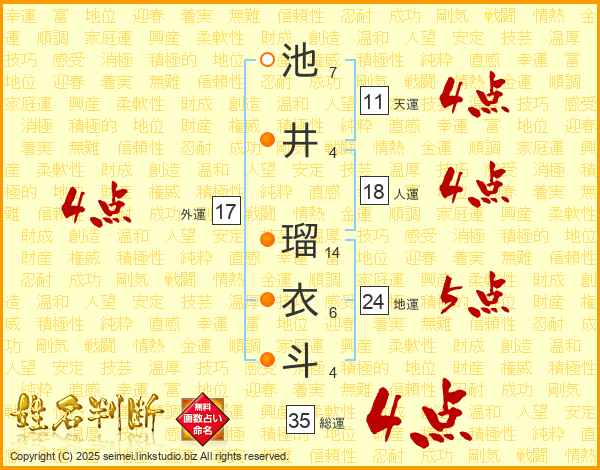 池(7画)井(4画) 瑠(14画)衣(6画)斗(4画)
