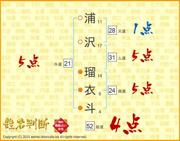 浦(11画)沢(17画) 瑠(14画)衣(6画)斗(4画)