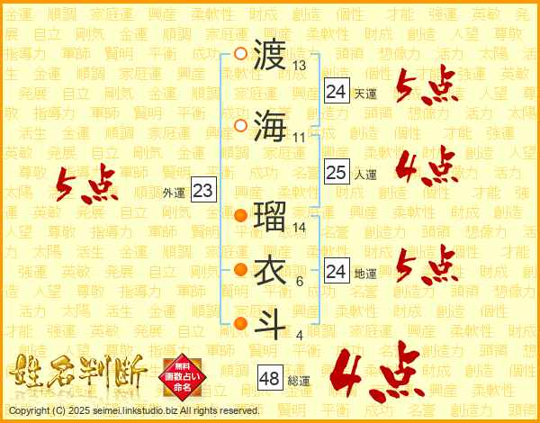 渡(13画)海(11画) 瑠(14画)衣(6画)斗(4画)