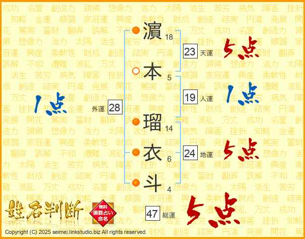 濵(18画)本(5画) 瑠(14画)衣(6画)斗(4画)