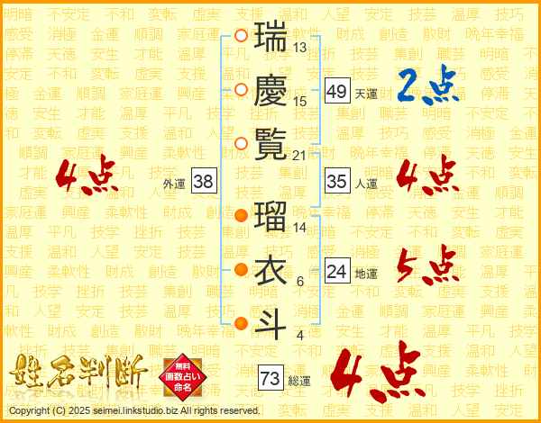 瑞(13画)慶(15画)覧(21画) 瑠(14画)衣(6画)斗(4画)
