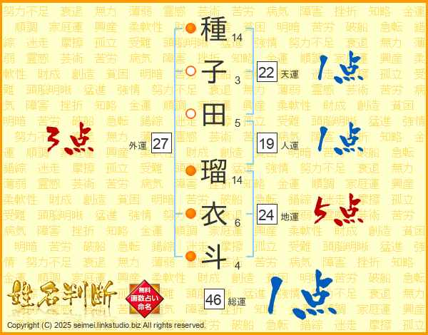 種子田瑠衣斗さんの総運は46画の1点!