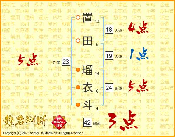 置(13画)田(5画) 瑠(14画)衣(6画)斗(4画)