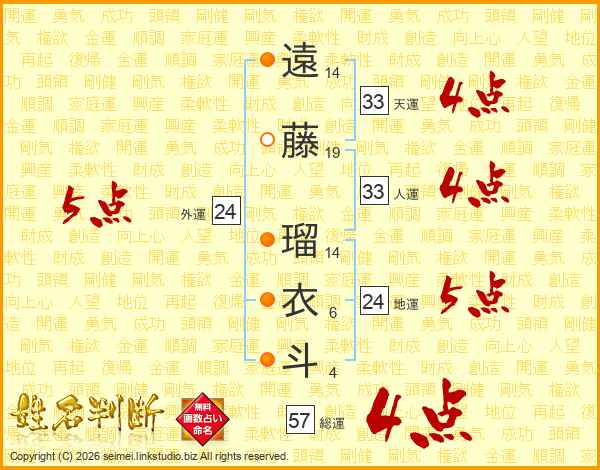 遠(14画)藤(19画) 瑠(14画)衣(6画)斗(4画)