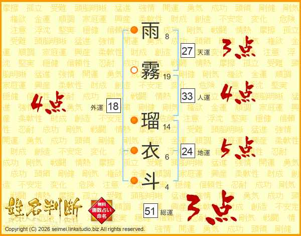 雨(8画)霧(19画) 瑠(14画)衣(6画)斗(4画)