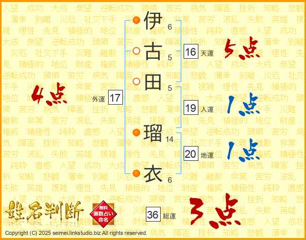 伊(6画)古(5画)田(5画) 瑠(14画)衣(6画)