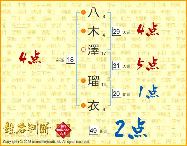 八(8画)木(4画)澤(17画) 瑠(14画)衣(6画)