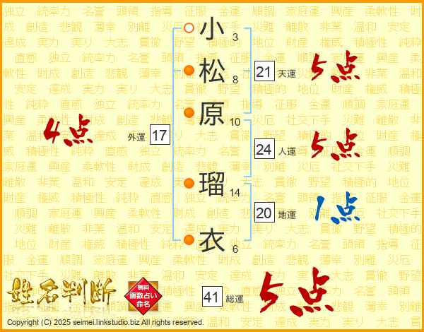 小松原瑠衣さんの総運は41画の5点!