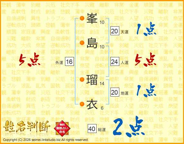 峯(10画)島(10画) 瑠(14画)衣(6画)