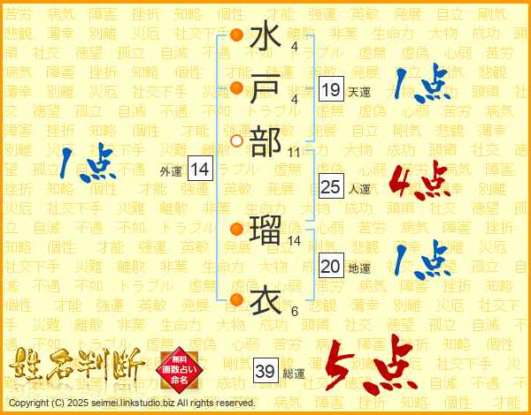 水(4画)戸(4画)部(11画) 瑠(14画)衣(6画)