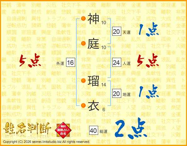 神(10画)庭(10画) 瑠(14画)衣(6画)
