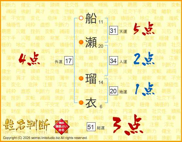 船(11画)瀬(20画) 瑠(14画)衣(6画)