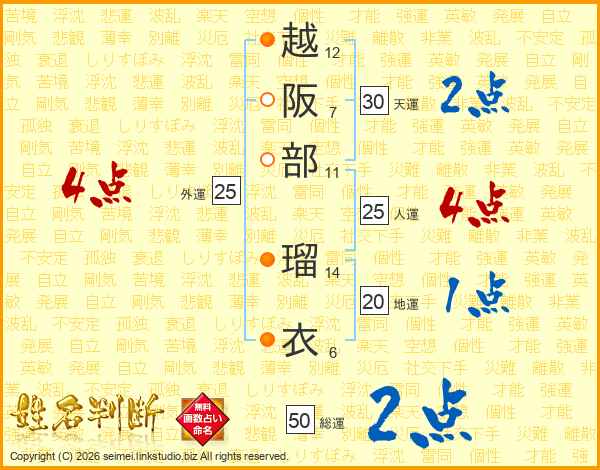 越(12画)阪(7画)部(11画) 瑠(14画)衣(6画)