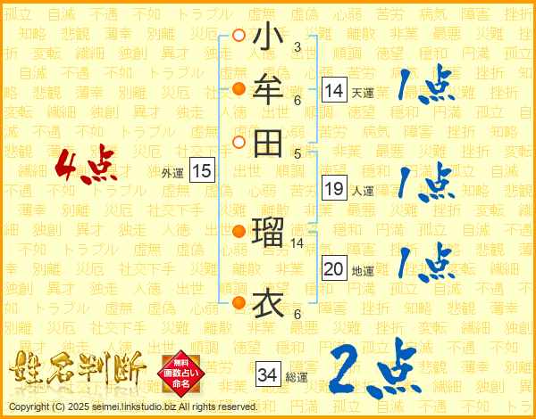 小(3画)牟(6画)田(5画) 瑠(14画)衣(6画)
