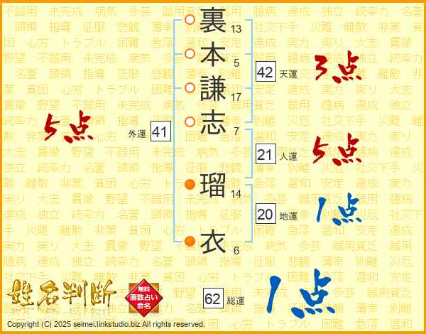 裏(13画)本(5画)謙(17画)志(7画) 瑠(14画)衣(6画)