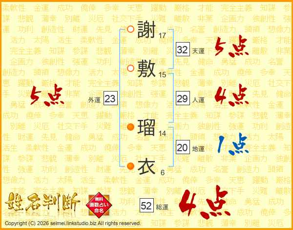 謝(17画)敷(15画) 瑠(14画)衣(6画)