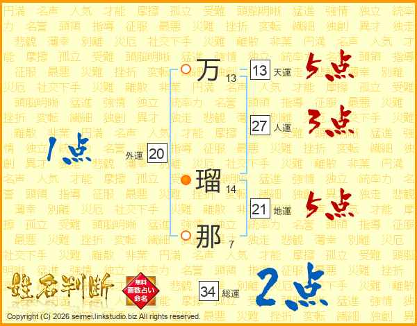 万(13画) 瑠(14画)那(7画)