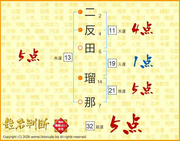 二反田瑠那さんの総運は32画の5点!