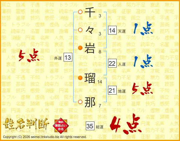 千(3画)々(3画)岩(8画) 瑠(14画)那(7画)