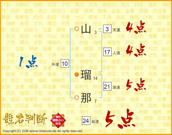 山(3画) 瑠(14画)那(7画)