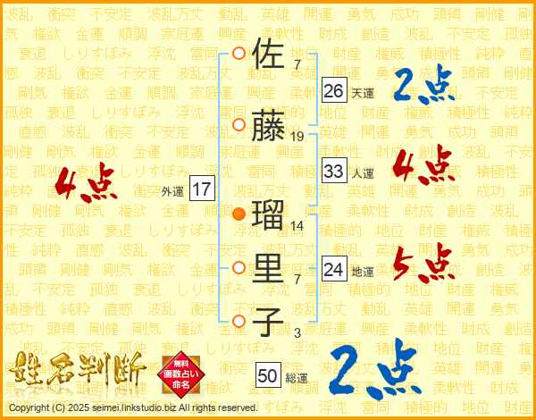 佐(7画)藤(19画) 瑠(14画)里(7画)子(3画)