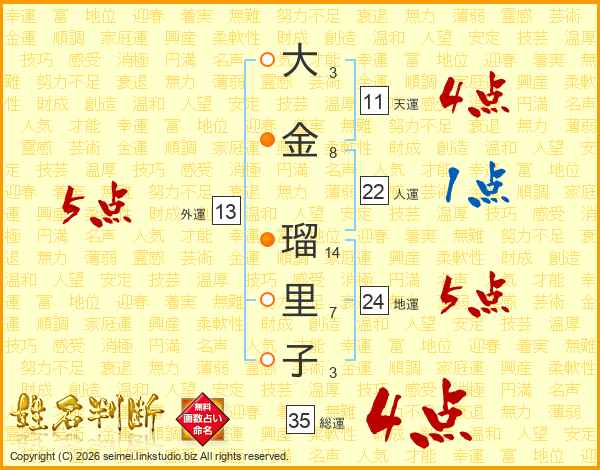 大(3画)金(8画) 瑠(14画)里(7画)子(3画)