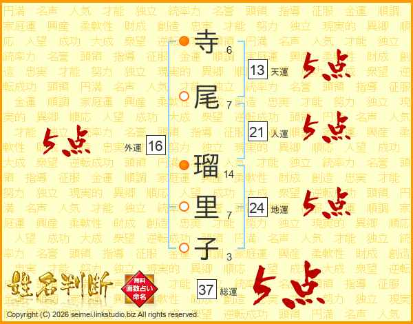寺尾瑠里子さんの総運は37画の5点!