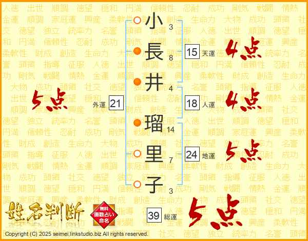 小(3画)長(8画)井(4画) 瑠(14画)里(7画)子(3画)