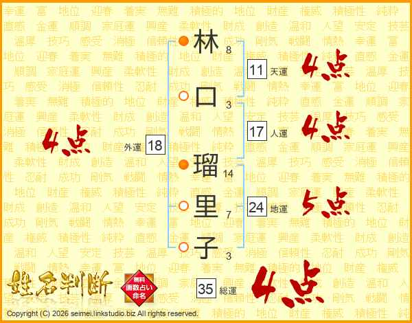 林(8画)口(3画) 瑠(14画)里(7画)子(3画)