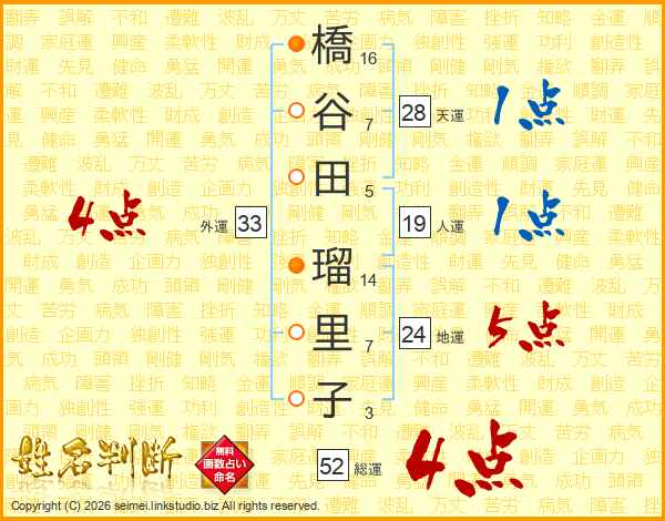 橋谷田瑠里子さんの総運は52画の4点!
